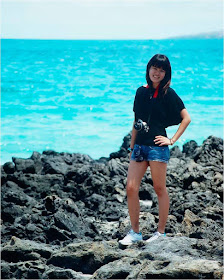The brilliant blue sea contrasts with sharp, piercing grey rocks in this portrait of Nasha.