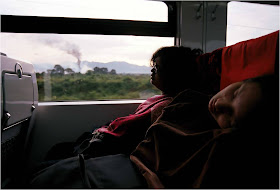Divya and Ruth asleep as the train passed a smoking factory in the distance.