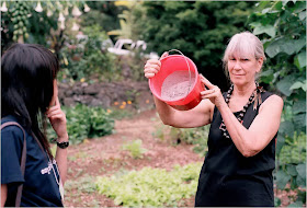 Nancy Redfeather shows us her home-made fertiliser (I think this was a calcium fertiliser derived from bones) while Kant Kaw looks on.