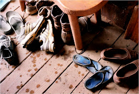 A sidelit shot of slippers, shoes and sandals outside the Redfeathers' home.