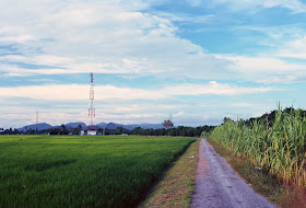 View of paddy fields and sugar cane plantations near Simpang Empat. The sun was virtually perfect, and the skies an impeccable pastel-blue, that evening.